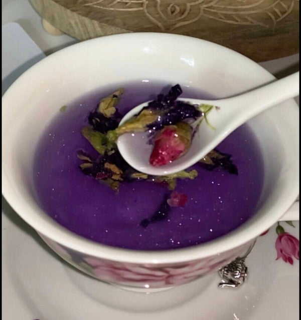 INGREDIENTS: Butterfly Pea Flower, Pink Rose Petals, Natural Tangerine Flavor
